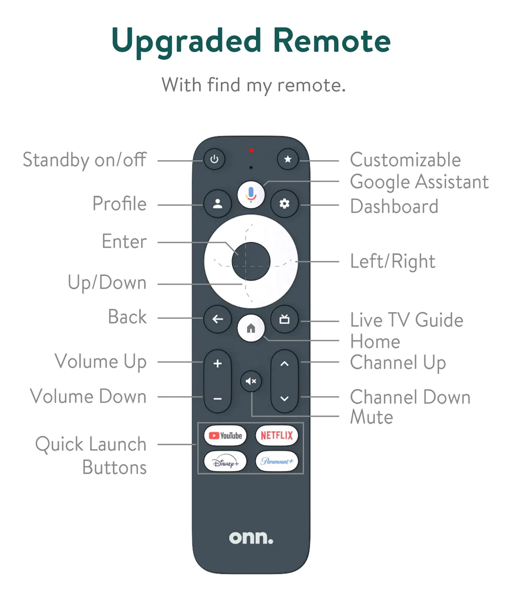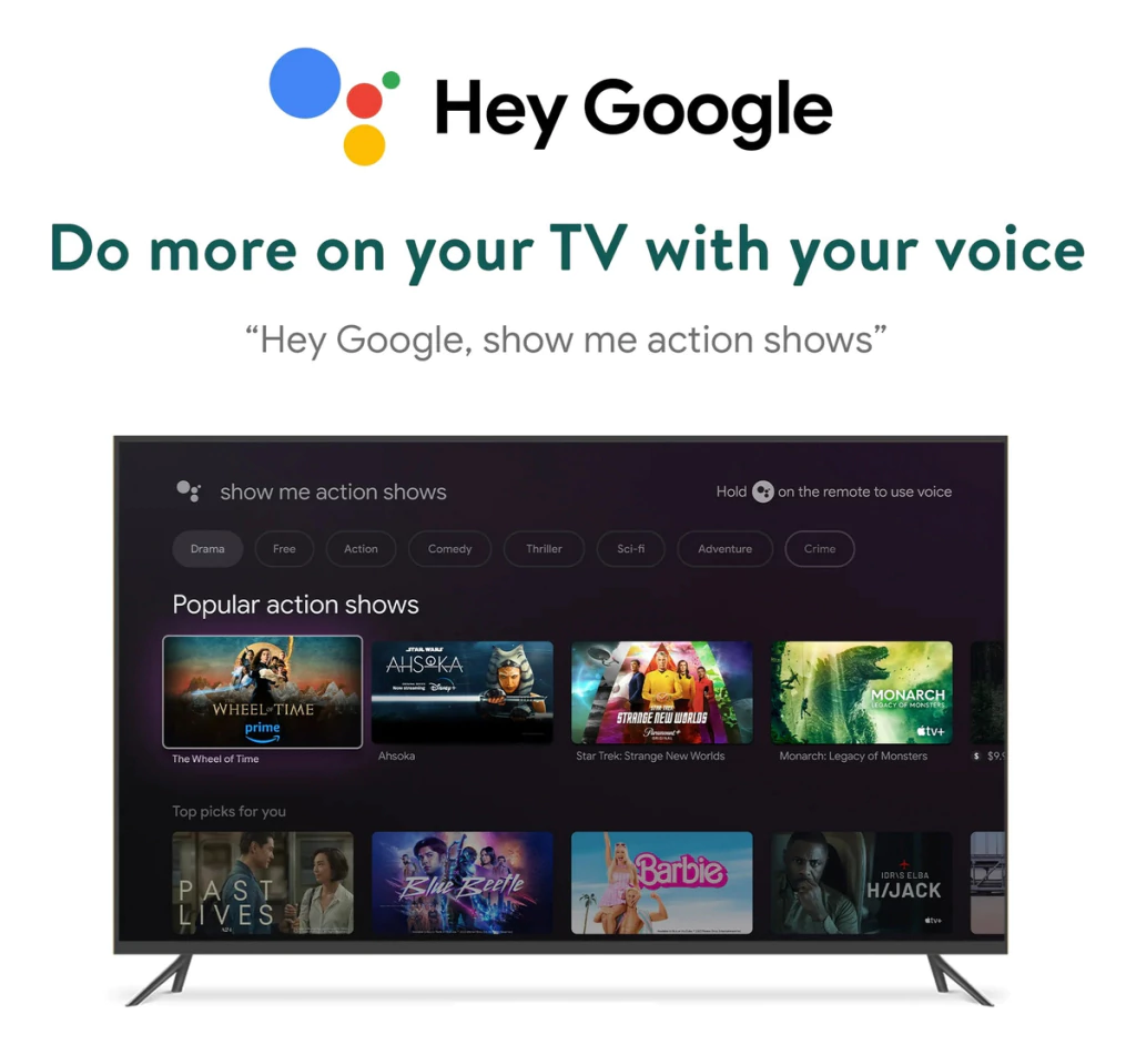 - Control por Voz con el Asistente de Google: Buscá contenido, ajustá el volumen y mucho más con simples comandos de voz a través del Asistente de Google integrado en el control remoto.