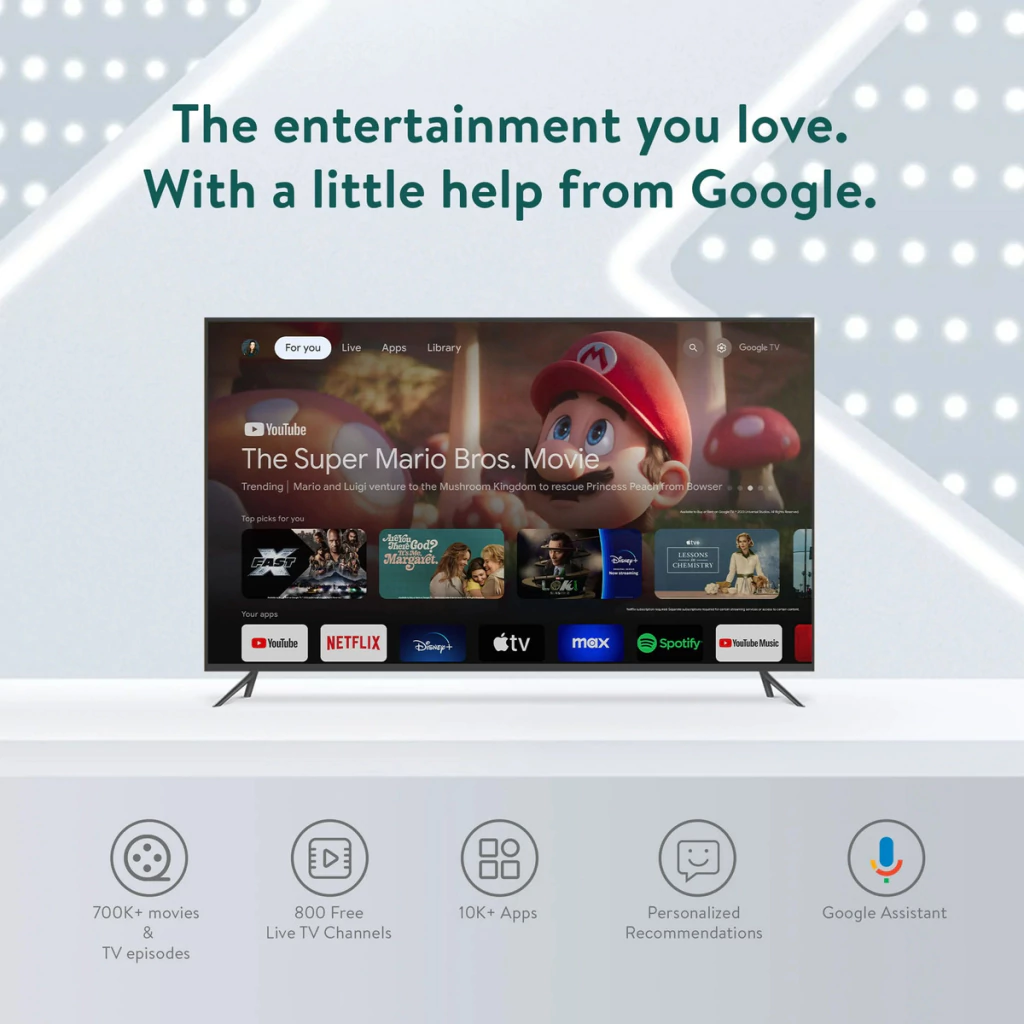 - Experiencia Google TV Inteligente y Personalizada: Disfrutá de una interfaz intuitiva que organiza todo tu contenido favorito en un solo lugar. Recibe recomendaciones personalizadas basadas en lo que te gusta, facilitando el descubrimiento de nuevas películas, series y programas.